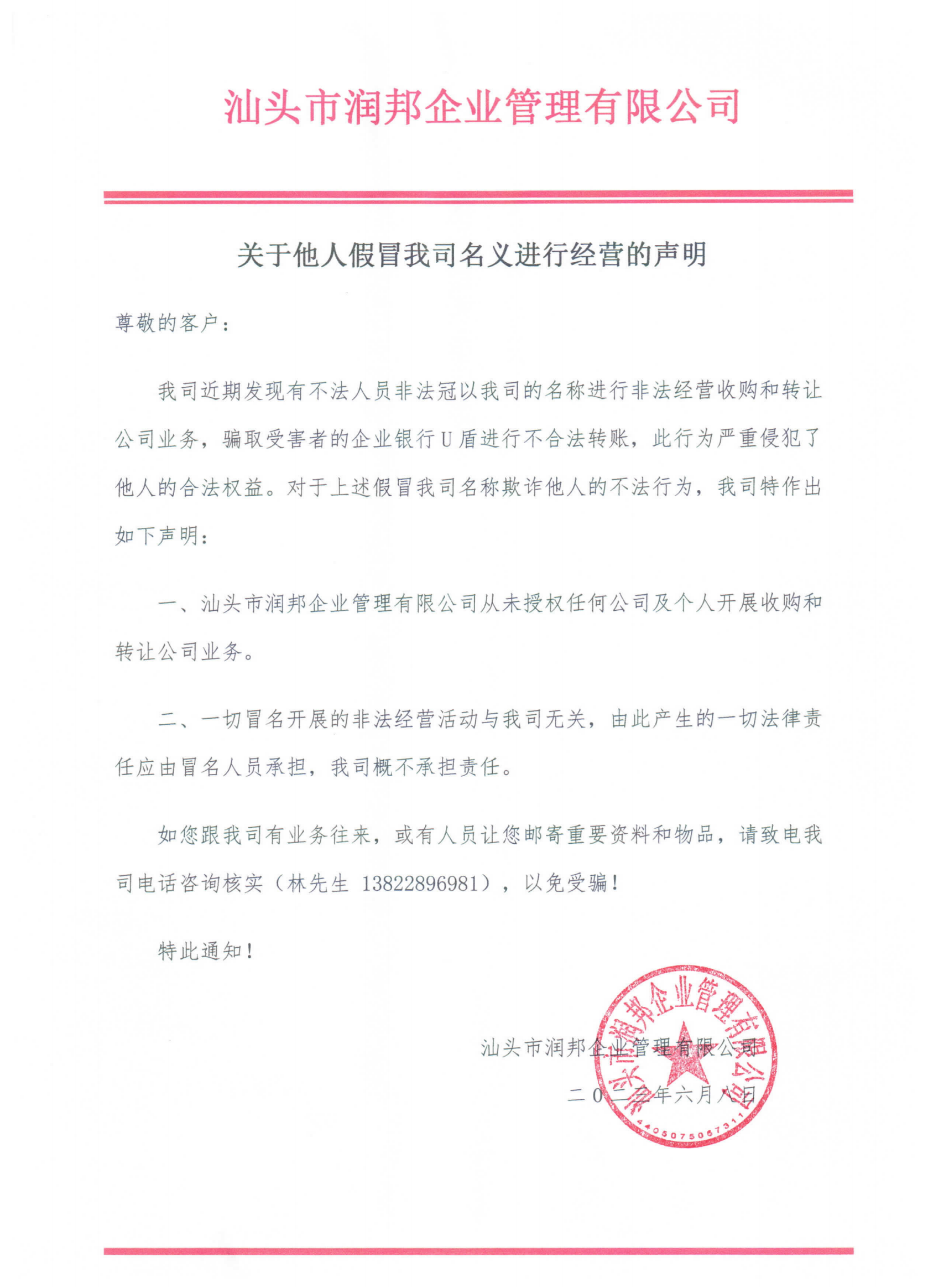 您好,歡迎訪問 汕頭市潤邦企業(yè)管理有限公司 網(wǎng)站!